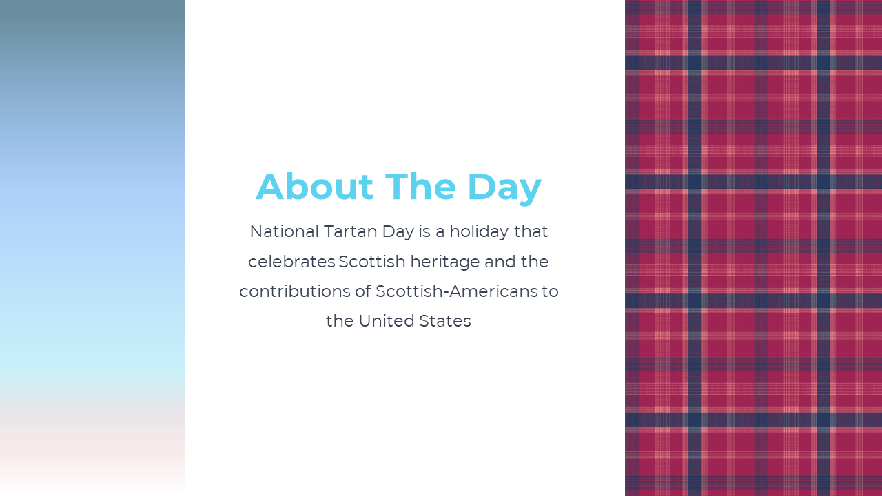 National Tartan Day is a celebration of Scottish heritage, observed annually on April 6th. The holiday recognizes the contributions of Scottish Americans to the United States and their role in shaping the country. Many people wear tartan clothing or accessories on this day to honor their Scottish ancestry. Parades and other events are also held to celebrate the occasion. National Tartan Day is a great opportunity to learn more about Scottish culture and history, and to connect with others who share a love for Scotland. Our National Tartan Day template includes various designs featuring tartan patterns, as well as slides to showcase Scottish traditions and history.