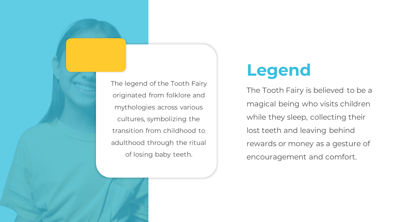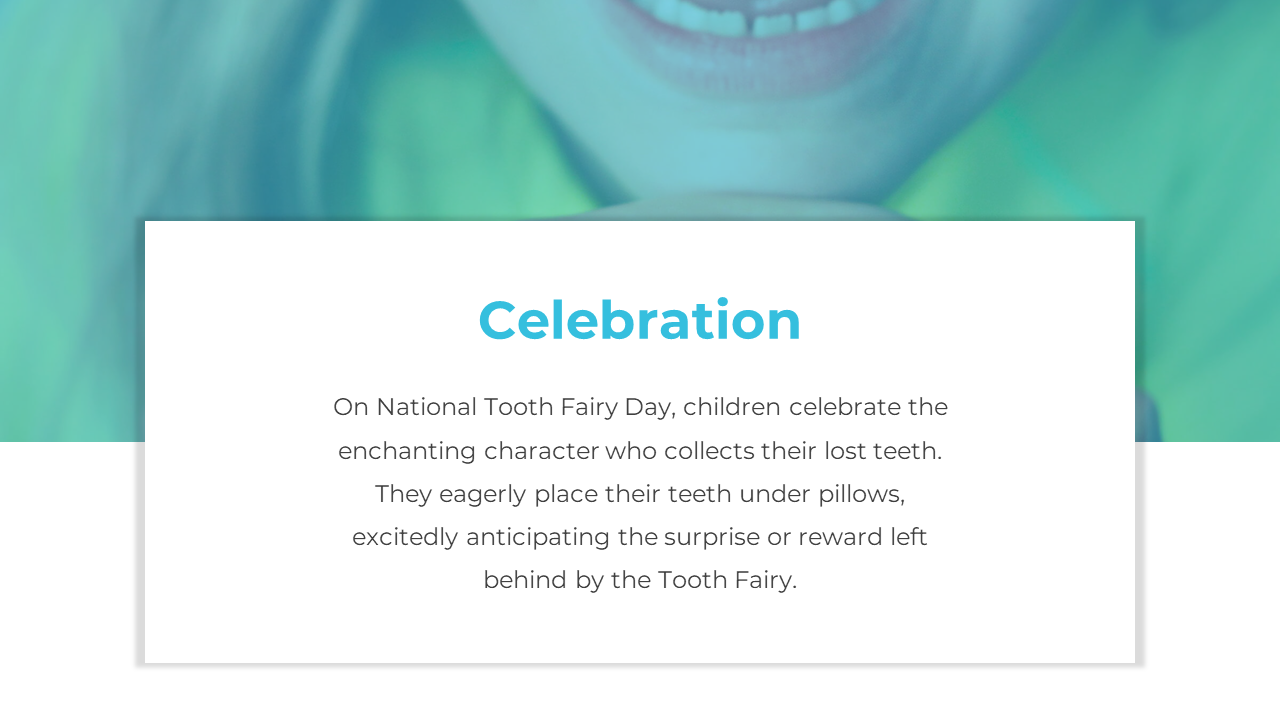 Celebrate the enchantment of childhood on National Tooth Fairy Day. This whimsical occasion embraces the magical concept of the Tooth Fairy, who exchanges lost teeth for small treasures, creating joy and wonder for children. This day is a celebration of growth, dental milestones, and the innocence of childhood. Our professionally designed template is perfect for parents, educators, and pediatric dentists who want to share information and stories about the Tooth Fairy and dental health. With customizable slides, you can create engaging presentations on the history of the Tooth Fairy, dental hygiene tips, and interactive activities for children. The template captivates the audience with charming visuals, child-friendly typography, and well-crafted layouts. Benefit from its user-friendly interface and create memorable presentations that educate and inspire. Embrace the wonder of National Tooth Fairy Day and let the magic of the Tooth Fairy come to life with this remarkable template.