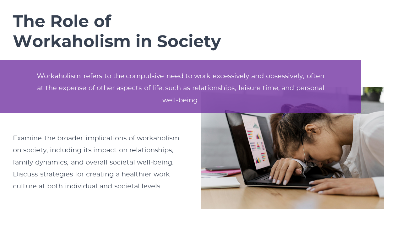 National Workaholics Day reminds us to find a balance between our work and personal lives. It emphasizes the importance of prioritizing self-care, maintaining healthy relationships, and engaging in leisure activities. This presentation highlights strategies for achieving work-life balance and provides practical tips to avoid burnout and improve overall well-being. With this template, you can effectively convey the significance of work-life balance in different presentations, inspiring others to prioritize their well-being while pursuing success.