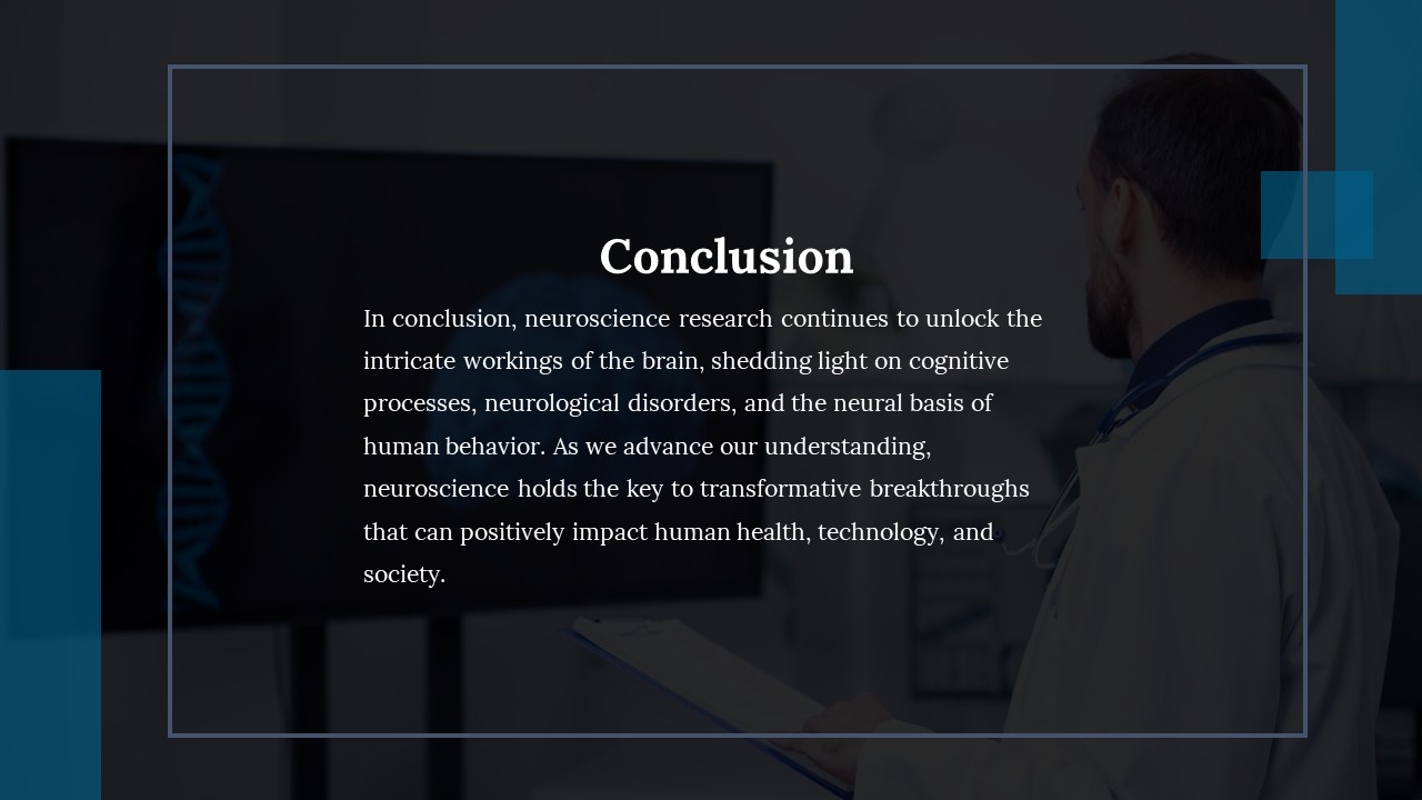 Neuroscience research involves the study of the nervous system, including the brain, neurons, and neural pathways, to understand cognitive functions, behavior, and neurological disorders. It's vital as it uncovers insights into brain mechanisms, leading to advancements in treatments for conditions like Alzheimer's, depression, and brain injuries. Neuroscience research deepens our understanding of human cognition, behavior, and health, shaping innovative therapies and interventions that improve the quality of life for individuals and contribute to the broader field of medical science. This presentation will be useful for medical professionals and students looking to deepen their understanding of neurology. Our customizable template will help you create a professional and engaging presentation with ease. Fully editable and professionalized slides. The "Neuroscience Research" presentation is sought after by neuroscientists, medical professionals, researchers, psychologists, educators, students, and institutions dedicated to understanding the complexities of the human nervous system.