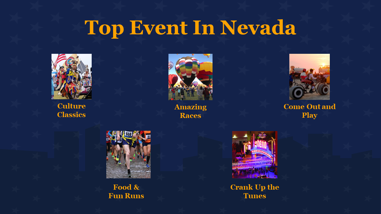 Nevada Day is a celebration of the state's admission to the Union on October 31, 1864. The day is a time for Nevadans to come together and celebrate their state's rich history and unique culture. Festivities typically include parades, picnics, and other community events. This day is an opportunity to reflect on the state's past and look forward to its future. Nevada is known for its stunning landscapes, including the rugged mountains and deserts, and its thriving entertainment industry in Las Vegas. Use our Nevada Day slide template to create a visually stunning presentation about the state's history, culture, and unique features.