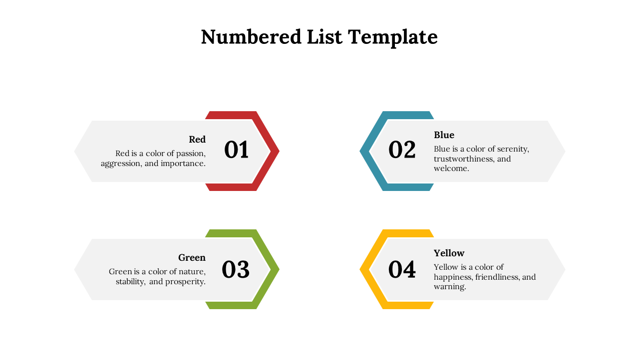 You can use our all-new numbered list PowerPoint templates for multiple presentations. It is suitable for business, sales, education, finance, etc. You can personalize this slide of your own; there are four nodes in the slide in four rectangular round-headed text boxes where you can add text freely. You can add this slide in between your slide presentations. The four nodes are colored with several colors that create an immense look. The numbers are highlighted with colors placed in front of the rectangles. Colors and visuals always grab the attention, so the audience should always be attentive to your presentation.