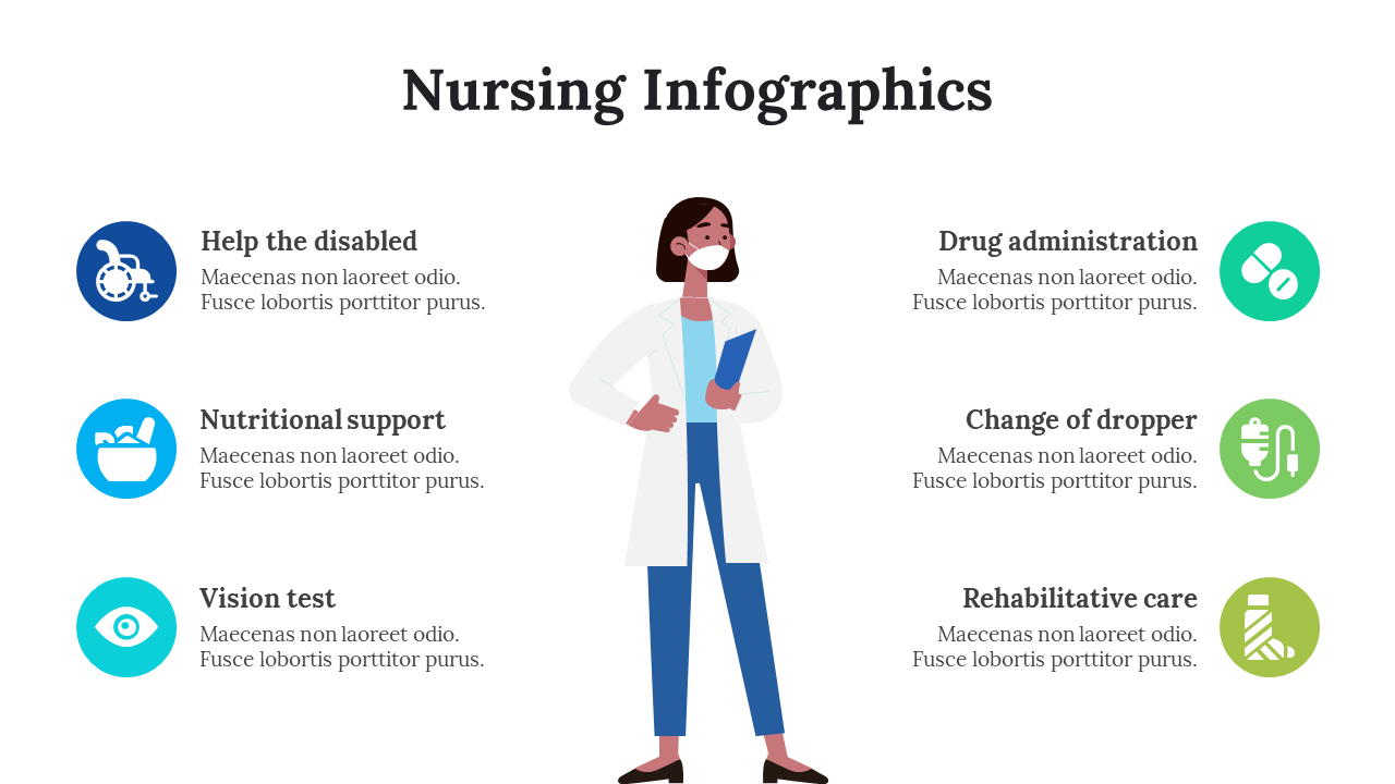 Nursing infographics offer a comprehensive overview of the nursing profession, including essential topics such as patient care, medical procedures, and healthcare advancements. Explore the key responsibilities and skills required for nursing professionals, learn about the latest healthcare trends, and gain insights into the impact of nursing on patient outcomes. Our presentation template is designed to help you communicate complex nursing concepts with clarity and engage your audience with compelling visuals. Enhance your nursing presentations and inspire others with the power of nursing knowledge, This template will help you to create a professional-looking presentation on or about Nursing infographics in no time.