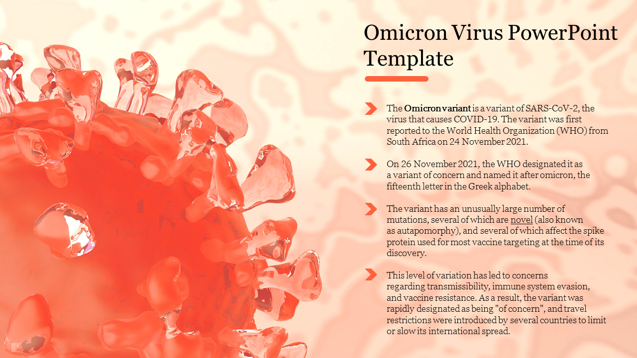 Make an outstanding presentation about the Omicron variant using this highly creative Omicron Virus PowerPoint Template. It is well-designed to help medical professionals, researchers to present the findings of Omicron. Even press people can use this slide to spread the information about this virus. It is completely customizable according to your presentation needs.