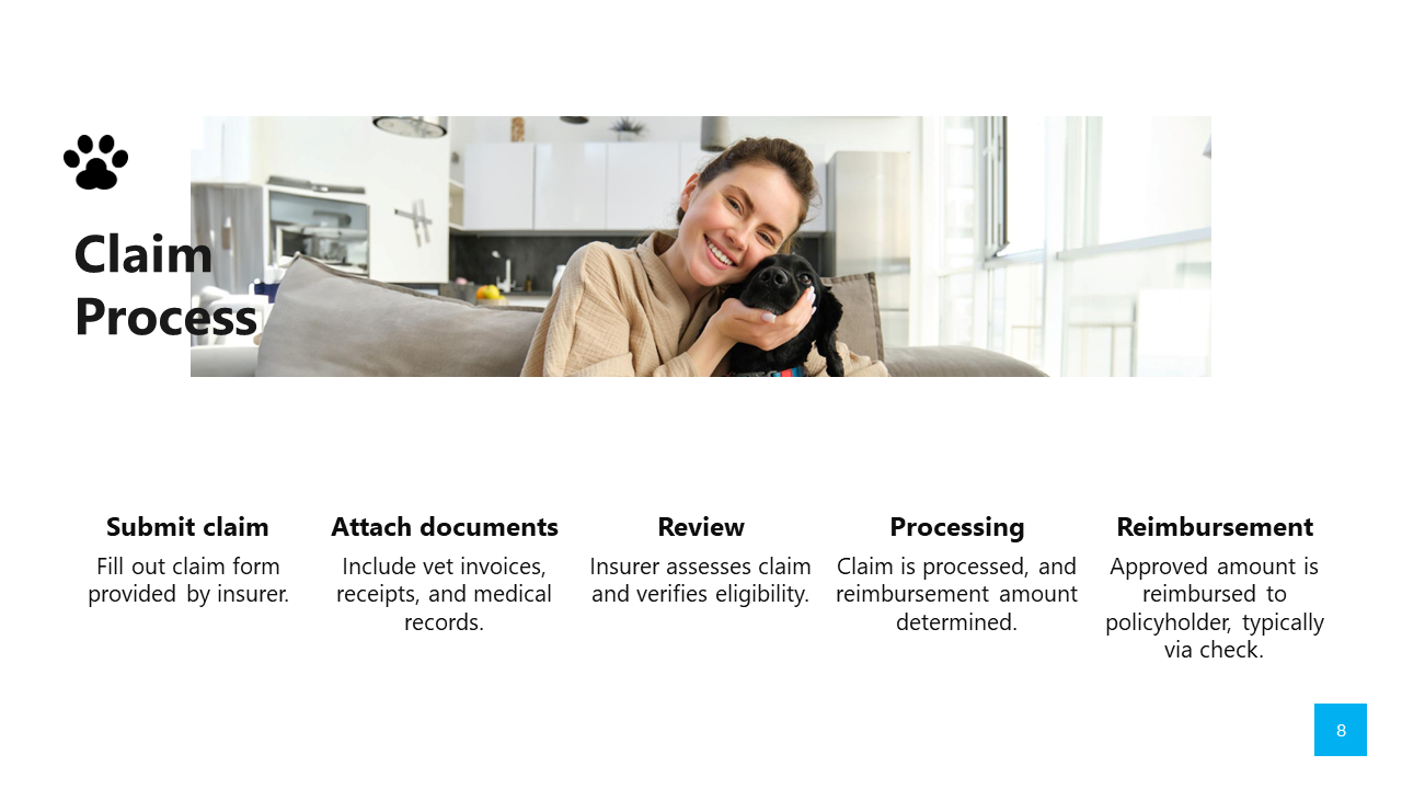 Our templates cover a variety of essential topics related to pet insurance, including coverage options, importance, types of pet insurance plans, claim process, benefits of pet insurance, and tips for choosing the right insurance plan for your beloved pet. Each slide is thoughtfully designed to convey important information in a clear, concise, and visually appealing manner, making it easy for presenters to educate and inform their audience. Whether you're delivering a seminar, training session, or client presentation, our templates provide the flexibility and versatility to create a compelling and informative presentation that resonates with your audience.