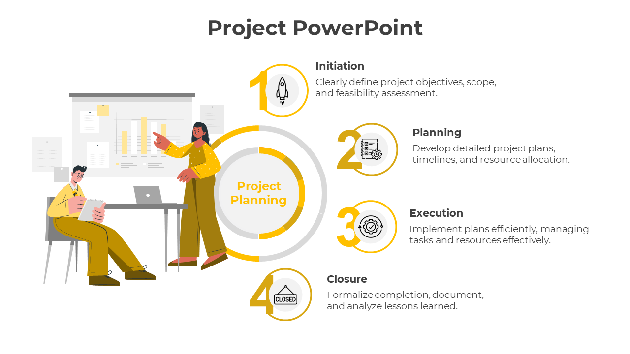 Our yellow-themed template, featuring four customizable options, facilitates efficient project management and communication. With intuitive features like task lists, timelines, and progress trackers, the template empowers users to visualize project milestones, track progress, and foster collaboration, thereby enhancing project outcomes and contributing to organizational success.