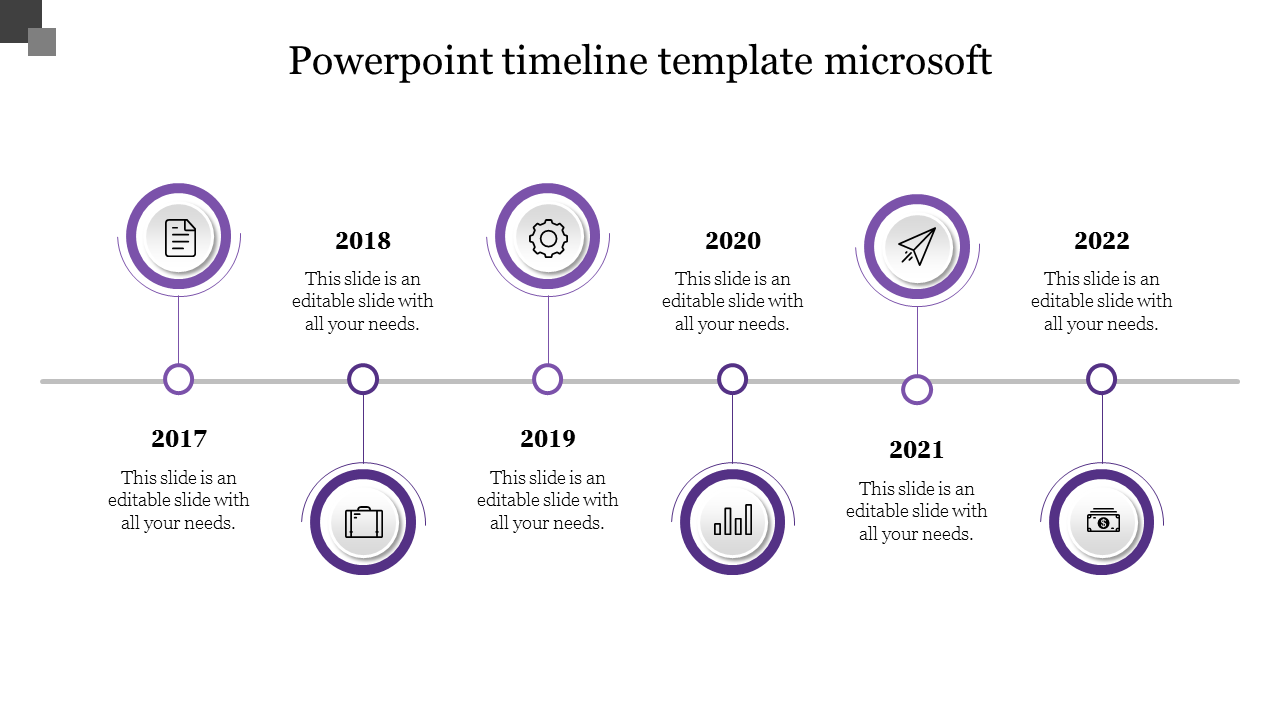 Here is a pre-made PowerPoint timeline template for your needs. It is a well-designed layout with a simple circle design. In addition, this is the perfect timeline slide for business events. It can neatly arrange your events in an organized way. The violet tone of this slide will impress the audience's attention. You can customize and change the color tone of the circles added to this layout. Also, you can modify the background themes to fit your presentation. It includes six nodes to support your descriptions. Give a creative touch to your timeline presentation by using this slide.