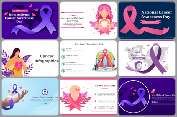 - Powerful Themes: Tackle any topic, from general cancer research to specific types like breast, skin, lung or colon cancer. We have dedicated slides for diagnosis, treatment, esophageal cancer ribbon theme, and even special awareness days like World Cancer Day, Breast Cancer Awareness Month, National Cancer Survivors Day, International Cancer Awareness Day, etc.