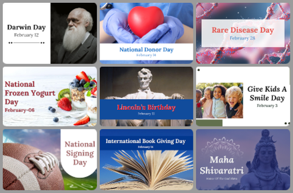 February is packed with holidays! From Valentine's Day and Presidents' Day to lesser-known gems like National Donor Day and National Kite Flying Day, our templates cover them all.