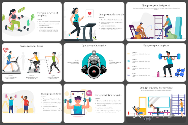 Gym presentation slides are an ideal tool to be used at the gym, workout places, fitness centers, and body health centers. These gym-theme layouts can lead you to create excellent presentations and slide shows about healthy body fitness through attractive visual images.