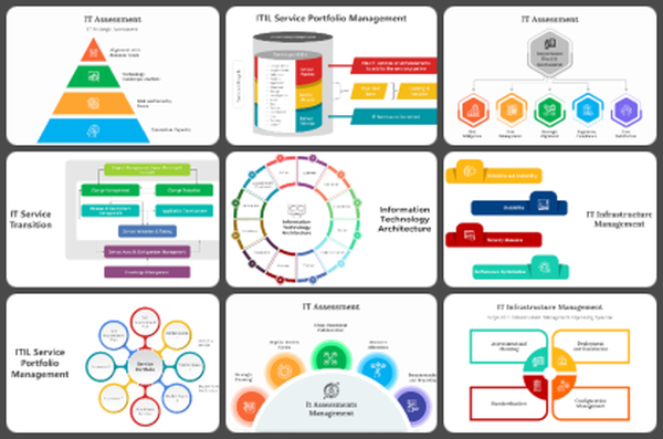 IT Themed Slides for Every Need: Our gallery includes slides for IT Governance, architecture, service management, ITIL problem management, service portfolio management, implementation, assessment, IT services policies structure, Geospatial information technology, IT service transition, infrastructure management, and more.