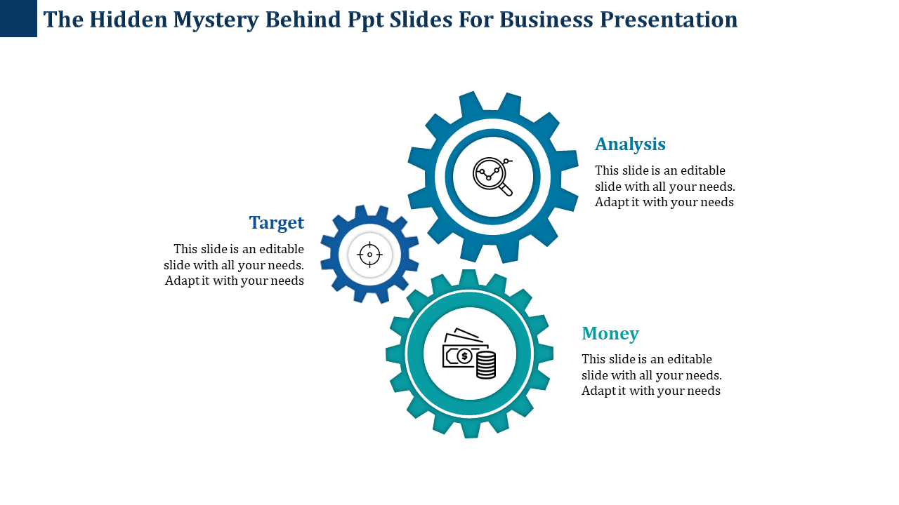 Unlock your Presentation Potential with our Business PowerPoint slides! The slide shown is clear and accurate. Three interconnected gear wheels labeled Target, Analysis, and Money are the main visual elements, each with self-explanatory icons to ensure your audience hears key points immediately underneath. Minimal design, combined with contrasting colors, ensures every piece stands out, and focuses.