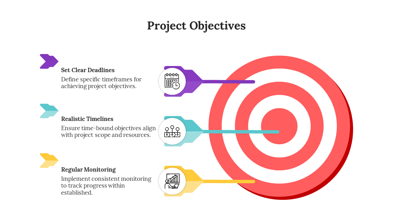 Embark on a journey of project success with our PowerPoint and Google Slides templates, placing a spotlight on the crucial concept of "Project Objectives." Tailored for professionals and teams, these templates redefine the narrative around project objectives, emphasizing their significance in organizational strategy alignment, stakeholder input incorporation, time-bound goal-setting, project scope definition, and cross-functional collaboration. Learn the art of navigating complex project landscapes with ease, ensuring that objectives are not just goals but strategic pillars driving project success. Ideal for project managers, team leaders, and business professionals, this template proves indispensable for those aiming to elevate their project management approach. Fully editable slides and a vibrant multicolor theme offer flexibility for customization, enhancing the visual appeal of presentations. From defining project scope to fostering collaboration, this template caters to a diverse audience, transforming project objectives into a dynamic narrative. Presenters benefit from increased engagement, clear communication, and the ability to showcase project insights dynamically. Encourage your audience to leverage this template as a strategic asset for delivering compelling presentations, leaving a lasting impact on their project narrative, and fostering success in project management endeavors.