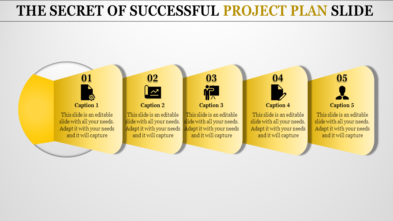 Disclose the project plans to your target audience by introducing our Project Plan PPT and Google Slides Template. The slide features five mixed-shape text boxes. Each of them comes with icons to represent planning, team meetings, collaboration and data management. Users can provide detailed insights, milestones or action items associated with each aspect of the project plan.