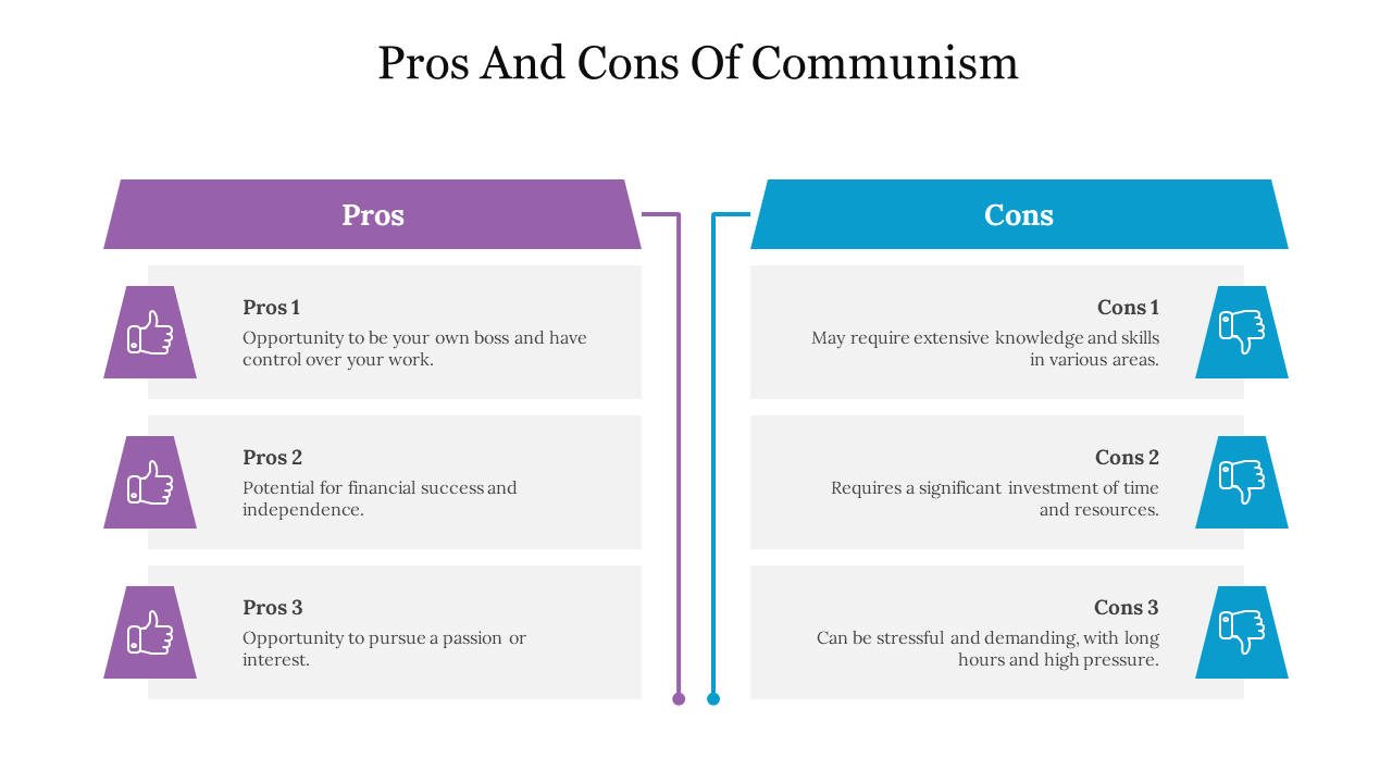 Communism is a political and economic ideology that aims to create a classless society where everyone has equal access to resources and opportunities. While it may sound good in theory, in practice, communism has its pros and cons. One advantage of communism is that it promotes equality and a sense of community among people. It also seeks to eliminate poverty and provide basic needs for everyone. However, one major disadvantage of communism is the lack of individual freedom and the suppression of dissenting voices. It often results in a centralized government with absolute power and can lead to economic inefficiency. Check out our Pros and Cons of Communism template to create a presentation on this topic.