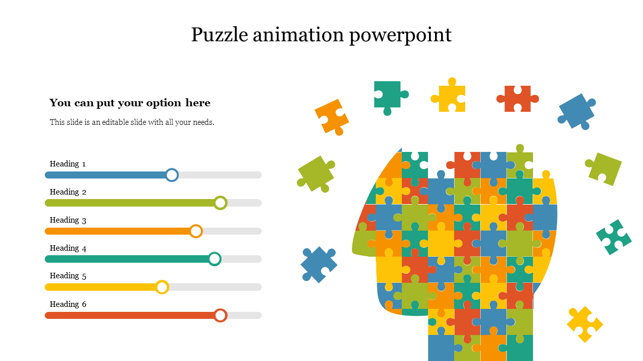 Our Puzzle Animation Powerpoint is an editable template with four headings and illustrations. These elements can easily be adaptable to demonstrate various concepts. In addition, This template is ideal for presenting six types of information. Users can also add an attractive shape and puzzle to this template. For example, this template has the human head puzzle with a text holder. However, Users are allowed to add text to each heading. Also, check our wide range of Animation puzzle PowerPoint templates. Users can customize the background colors, text formats, size, etc.