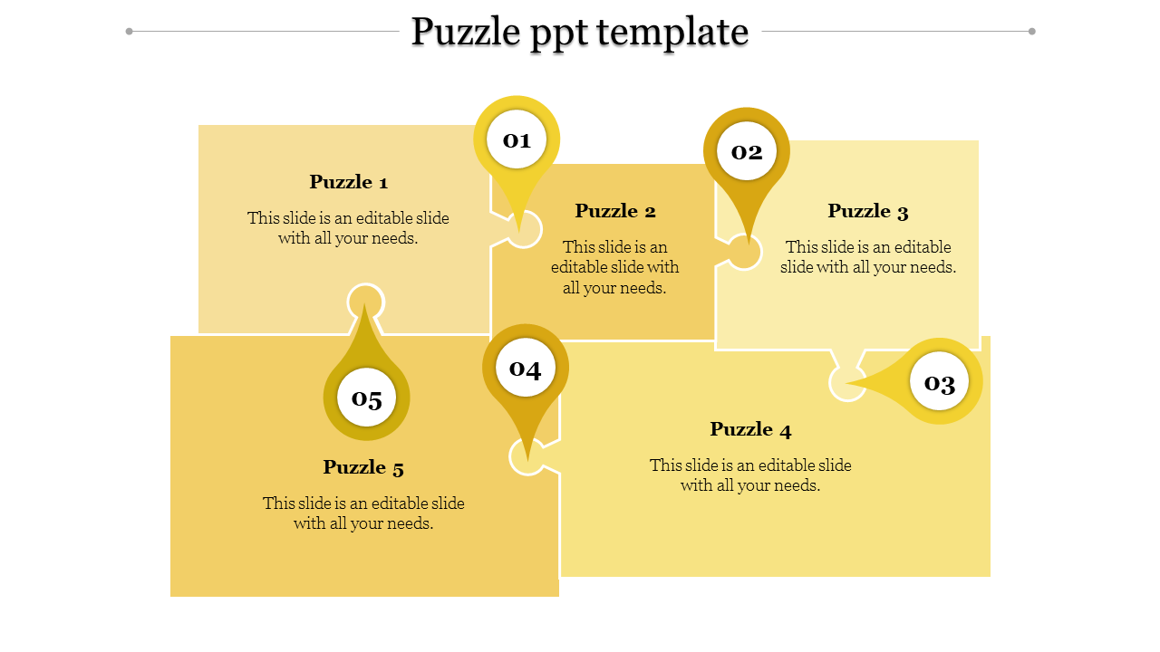 Jump into the world of thinking and problem-solving with our exciting Jigsaw Puzzle PowerPoint template. This template has five bright yellow puzzle pieces on a clean white background, with five location symbols showing teamwork and shared ideas. Each puzzle piece has space for captions, so you can add your own key points, data, or steps with easy customizing the nodes.