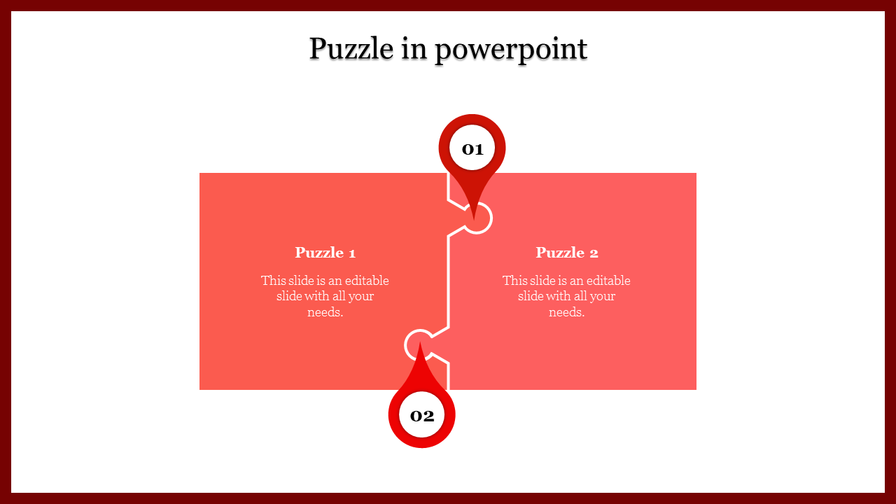 Captivate your audience with our Puzzle PowerPoint template. Our template purpose is likely to present information in a way that is engaging and easy to understand. By separating the information into two “puzzle pieces” the presenter can reveal the information one piece at a time, keeping the audience engaged. The use of puzzles might also be metaphorical, suggesting that the two pieces of information together form a complete picture. With editable colors, icons, and text boxes, you can tailor each puzzle piece to represent various aspects of your presentation, creating a cohesive and visually appealing narrative.