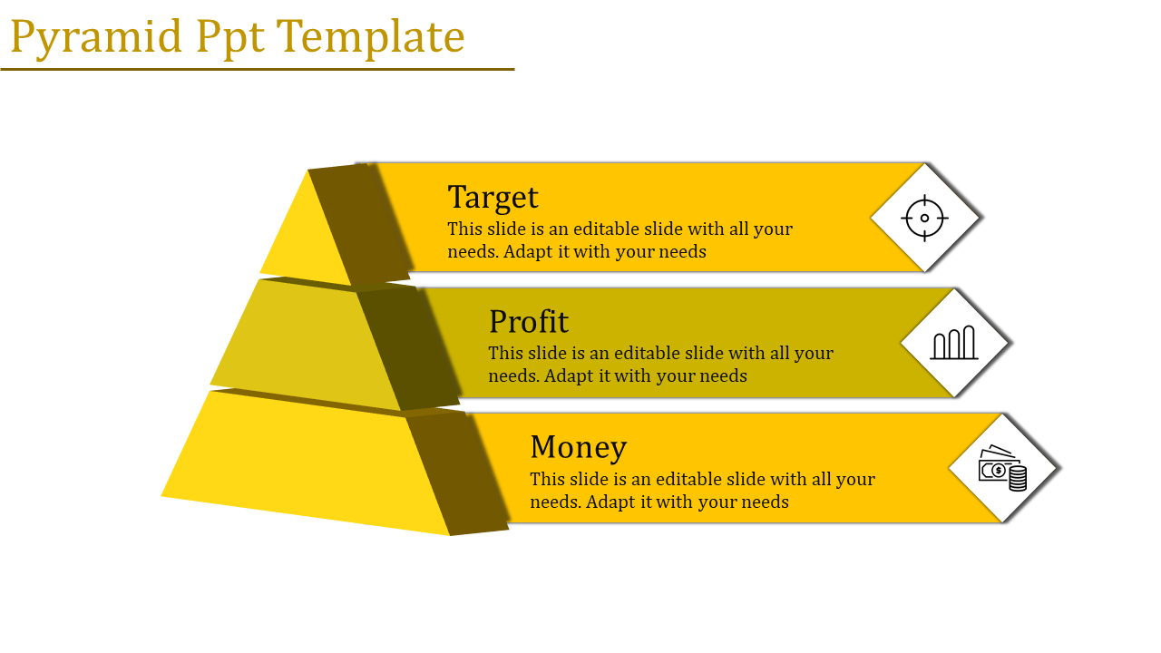 Download this pyramid PPT template for your professional presentation. The template is practical, with three nodes colored in the yellow shade. The user can use the template for business presentation, which the user can add with text in the given nodes. This can bring all the necessary details into these fully customized nodes. Download this template and gain the audience's appreciation. Try now!.