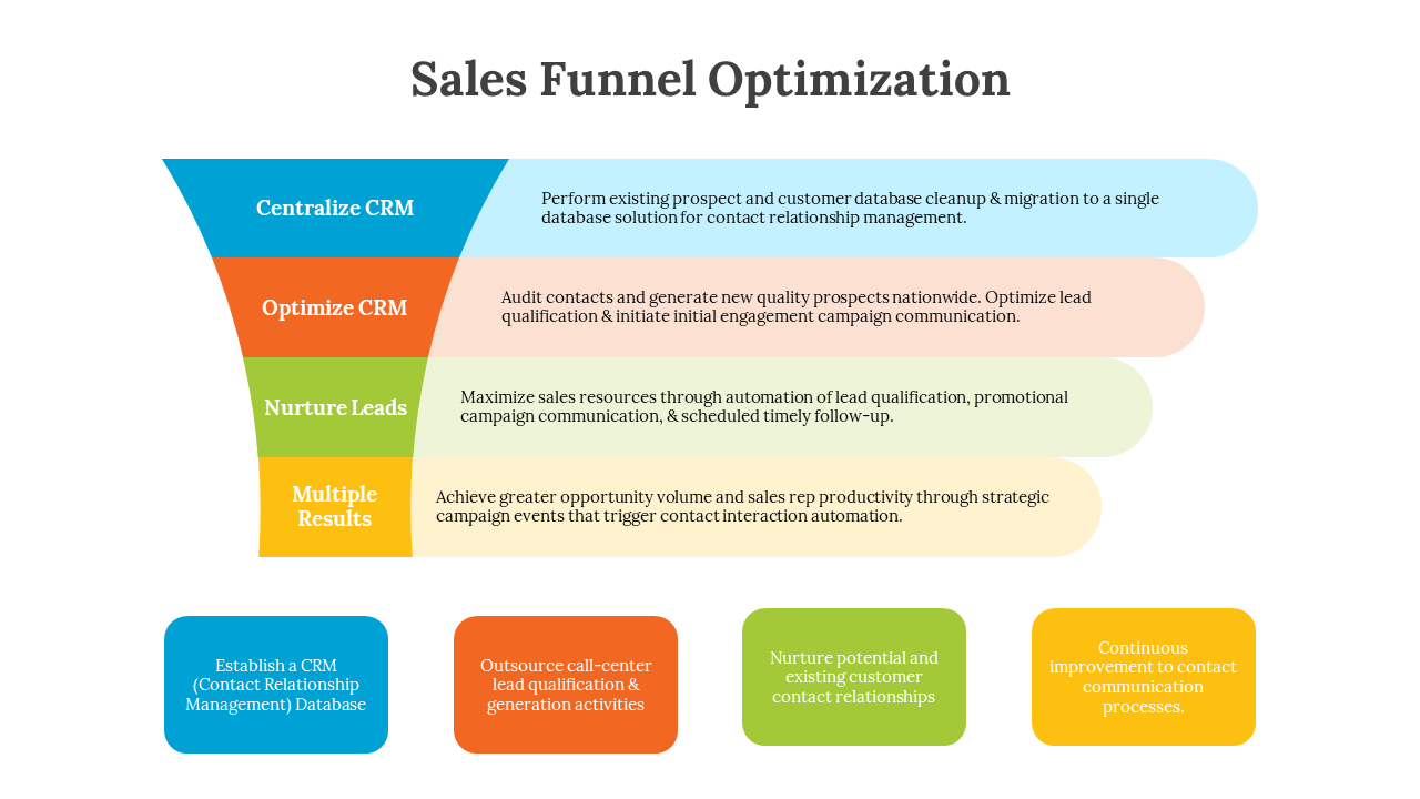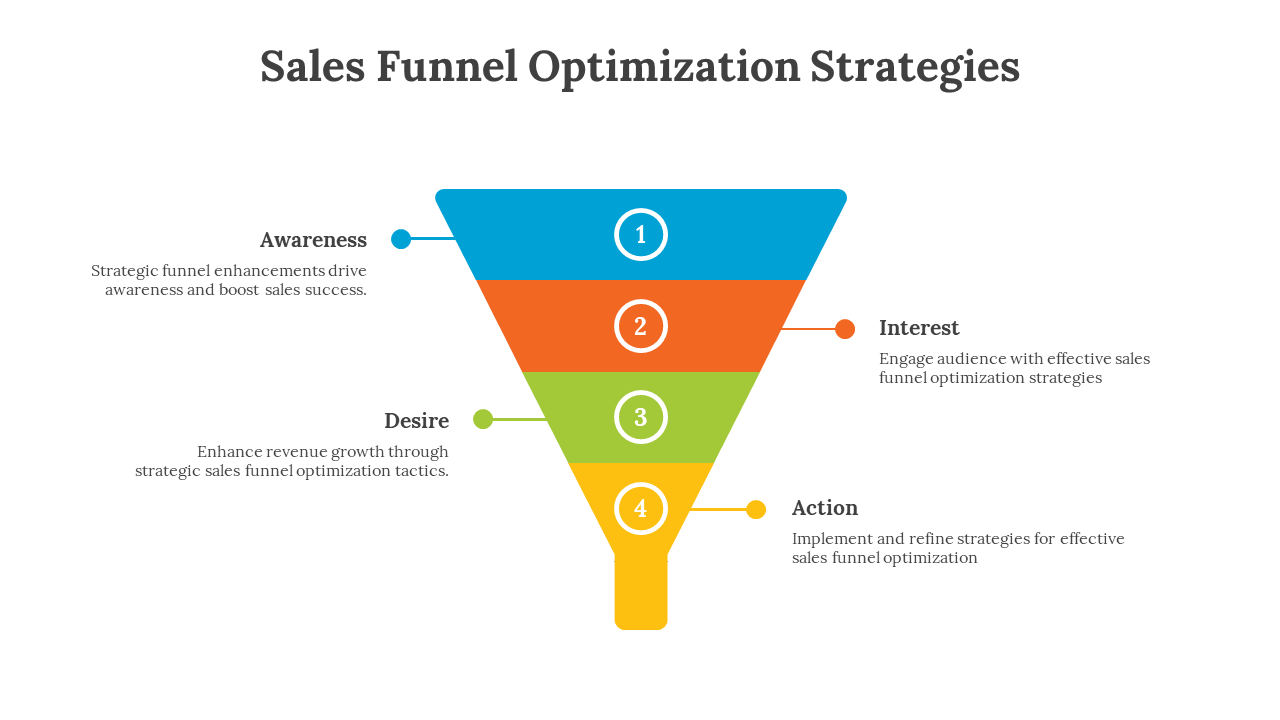 Sales Funnel Optimization, also known as marketing funnel optimization, is a strategic process that maximizes conversions and revenue at every customer journey stage. This concept focuses on understanding the customer's path, from initial awareness to final purchase, refining key touchpoints to enhance effectiveness. By employing data analysis, messaging refinement, and streamlined sales processes, businesses can significantly boost sales efficiency and revenue growth. It's a crucial component of successful sales and marketing strategies, helping adapt to evolving customer behaviors and preferences while achieving revenue goals. Our PowerPoint simplifies crafting engaging presentations on sales funnel optimization strategies, with fully editable slides to illustrate key concepts effectively. Tailor content and design to your needs, ensuring a polished and visually appealing presentation. Use this template to educate your audience, share insights, and inspire action for enhanced sales processes and revenue growth. Explore Sales Funnel Optimization's potential today.
