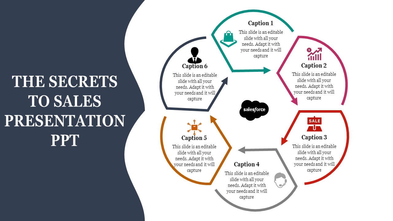 Lift your sales presentations to new heights with our Sales Presentation PowerPoint Template. The slide comes with a clean white backdrop. A captivating floral model takes center stage, featuring six dynamic arrows radiating from the core. Each petal of this vibrant figure is provided with icons representing sales growth, strategies, and marketing skills. It is painted in an array of vivid colors.