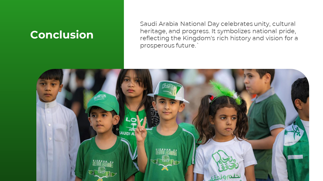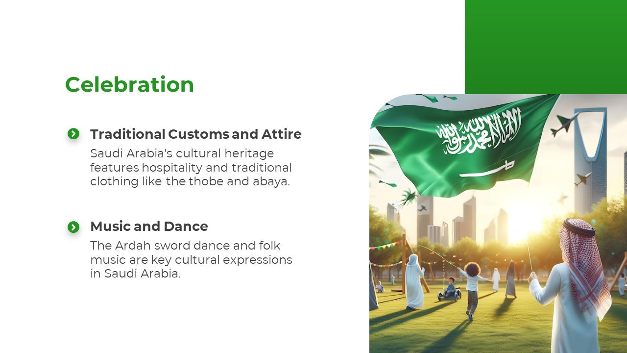 Celebrating Unity and Progress Saudi Arabia National Day commemorates the unification of the Kingdom of Saudi Arabia on September 23, 1932. It is celebrated by Saudis nationwide, including government officials, religious leaders, and citizens of all walks of life. The day is marked with patriotic displays, cultural events, traditional music, and fireworks, showcasing Saudi Arabia's rich heritage and achievements. Participants include people of all ages, from students to elders, who come together to express their pride in their nation and celebrate its unity and progress.