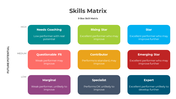 This template facilitates the creation of comprehensive skills matrices, ensuring clear visualization of employees' capabilities. With fully editable slides, users can customize layouts and graphics to match their organization's needs and branding. The template empowers presenters to efficiently convey employees' skill sets and development needs, saving time and effort. By leveraging this tool, users promote talent development and organizational growth.