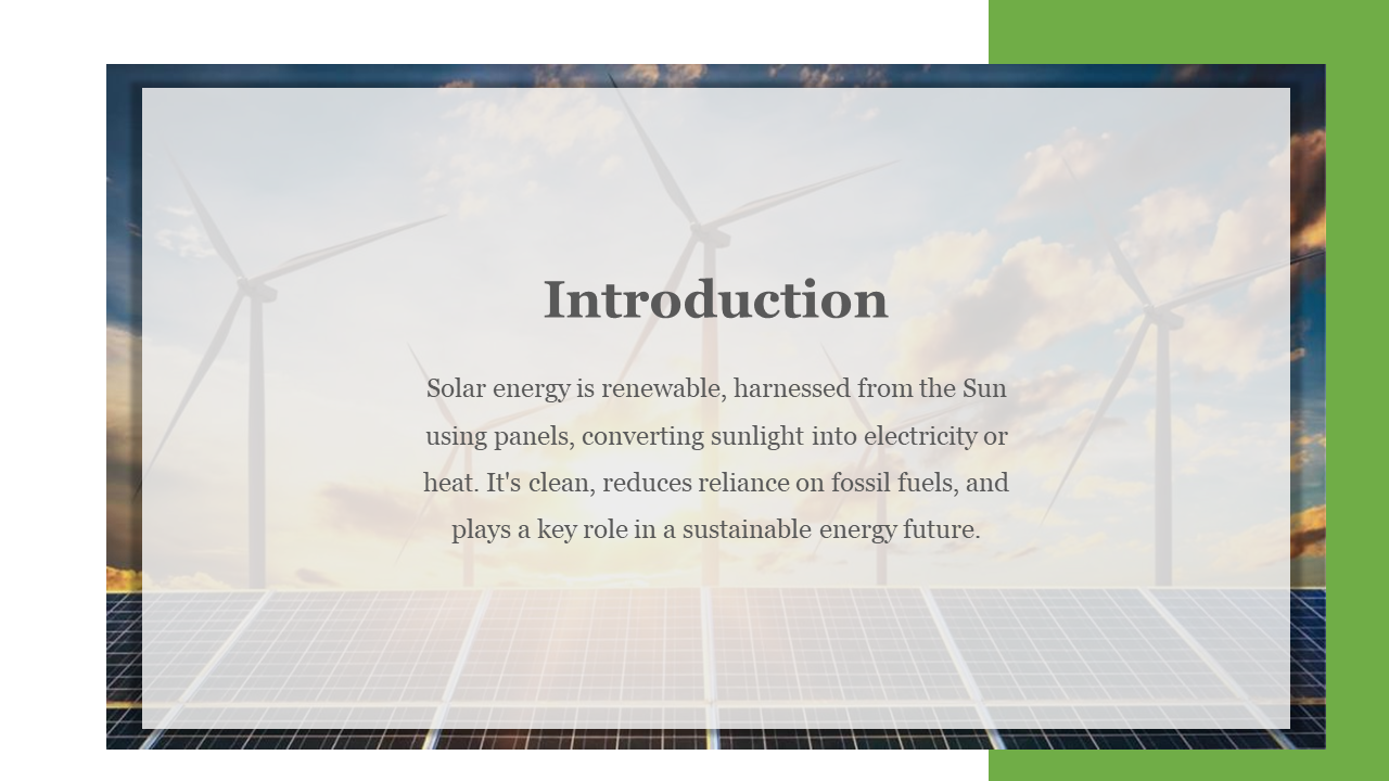 Solar Energy provides an introduction to this renewable energy source. It covers the generation of solar energy through photovoltaic cells and solar thermal systems. The benefits of solar energy, such as reduced carbon emissions and cost savings, are discussed, along with its diverse applications in residential, commercial, and industrial sectors. The integration of solar energy into the power grid and the importance of energy storage technologies are highlighted. The presentation concludes by encouraging sustainable energy choices. A visually appealing template with solar energy-themed graphics and colors complements the content and engages the audience.