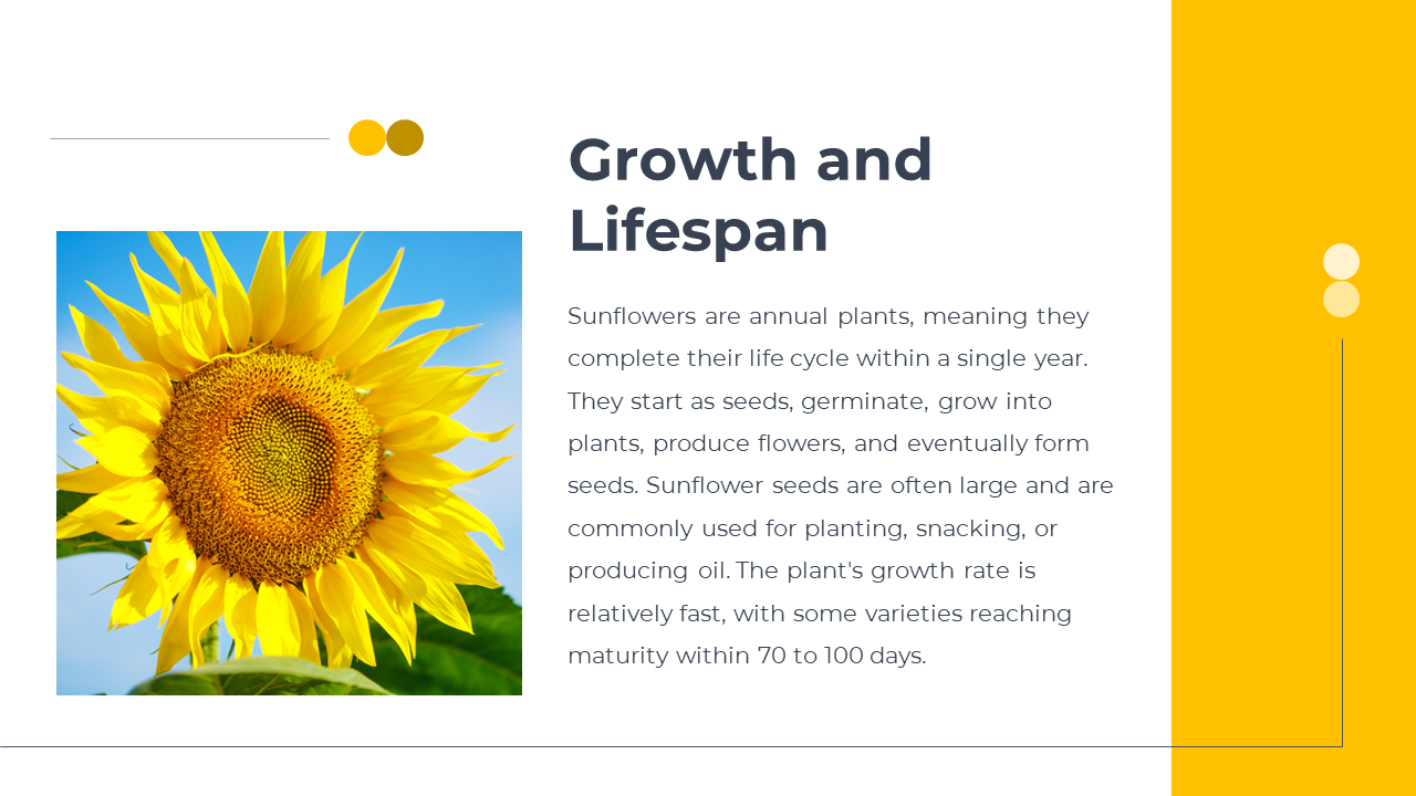 Sunflowers, with their vibrant petals and towering stems, symbolize adoration, loyalty, and vitality. These remarkable flowers have a unique ability to follow the sun's path, turning their faces towards its warm rays throughout the day. In our presentation template, you'll discover the captivating world of sunflowers, explore their fascinating characteristics, and learn how to incorporate their symbolism into your own presentations. Whether you're delivering a presentation on nature, art, or even personal growth, this template will help you shine a spotlight on your content and engage your audience effectively.