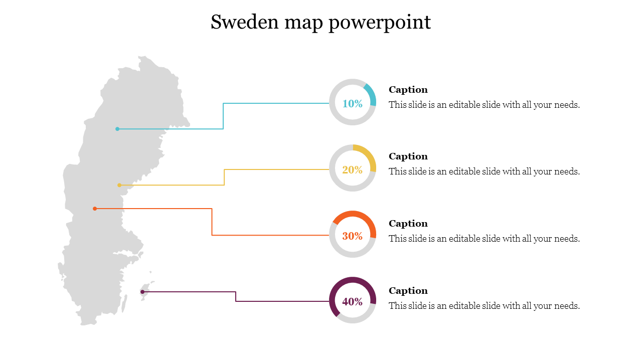 Sweden is the land of the "Midnight Sun," but you can't tell that from its old-fashioned map. If you have any business in Sweden and have been collecting inspiration for your PPT, this slide is for you. With four nodes of location tags connected, it makes for a beautiful blend of simplicity and detail. You can also edit its map layout and colors until you get the perfect color scheme for your visuals! As it is completely editable, you are free to personalize it to fit your needs. Make your crowd glued to their seats with this slide!