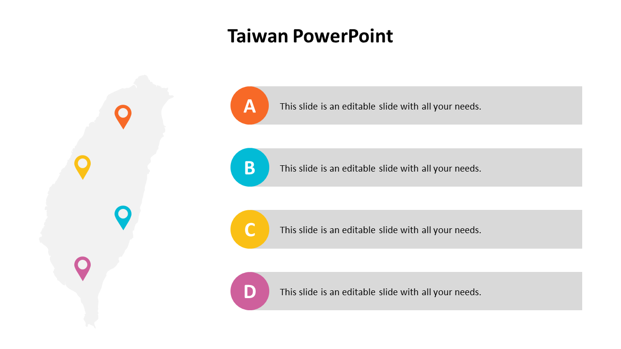This is a four nodded template. This template has a map outline of Taiwan as its central-themed feature. The four nodes are vertically arranged in the right region of this template. Employ this simple map template to amaze your audience. Grab now!!!