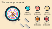 Kickstart your presentation with our impressive Target Template PowerPoint! Featuring a bullseye diagram coupled with a multicolor bar chart and two caption spaces, this slide is designed to captivate your audience. Professionals in sales, marketing, project management, and more can effectively utilize these slides to illustrate targets, goals, and performance metrics with clarity and impact. Additionally, seamlessly integrated with Google Slides Themes, our templates offer convenience and versatility for creating impactful presentations. Impress your audience and elevate your presentations to new heights. Explore our Target Template PowerPoint today and take your presentations to the next level!