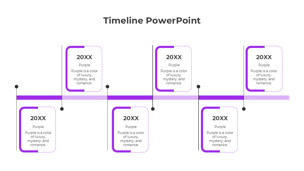 i) Our template overall design uses shades of purple and white text on a light background and six timeline boxes with captions. There is a placeholder text in each box so you can customize it according to your needs.