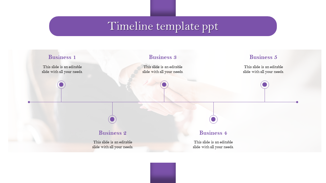 Get this accessible template with five nodes uniquely designed for explaining business vividly. The nodes are presented to explain your essential points about business and its merits. The backdrop handshake image looks soo relatable to the theme. You can witness your theme explained through the timeline PPT template diagram and caption of this Template. The animation which is in the center carries all the important contents. Commence downloading this Template and experience its attributes.