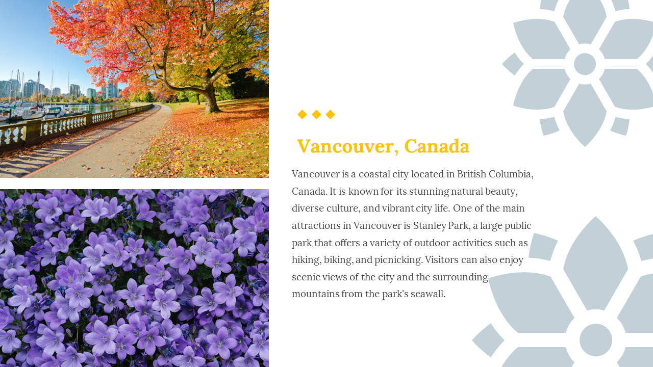 Are you looking to present an attractive and impressive showcase for your travel audience? Travel agents, bloggers, or educators can use this type of slide for engaging and informative presentations. The template comes with a variety of slides, including maps, timelines, and photo galleries. It is designed especially with different layouts and colors to attract every audience and be eye-catching. You can replace the pictures with ones of high-definition quality to make them more visually appealing.