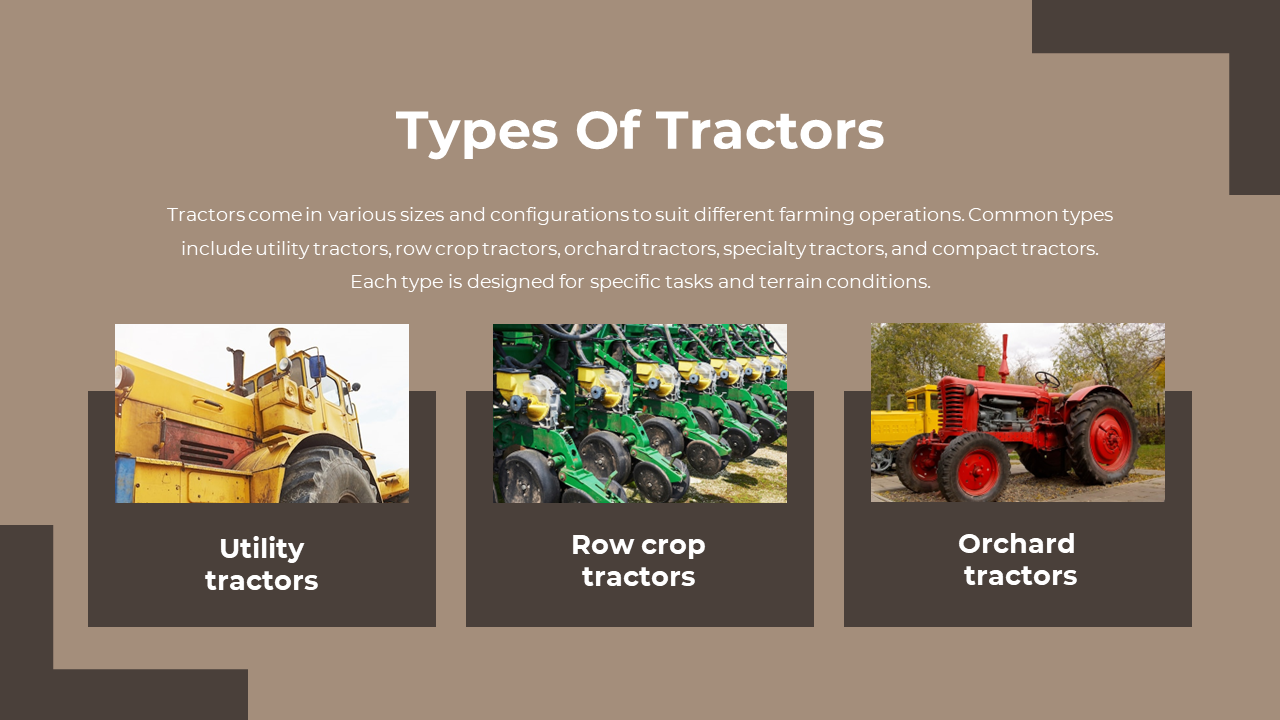 A tractor is a powerful vehicle designed to perform a variety of tasks related to agriculture, construction, and landscaping. It is equipped with a powerful engine and a sturdy frame, as well as specialized attachments such as plows, cultivators, and mowers. Tractors are commonly used to till soil, plant crops, harvest produce, and transport heavy loads. They come in various sizes and models, from compact utility tractors for small-scale operations to massive industrial tractors for large-scale farming or construction projects. Tractors have greatly improved efficiency and productivity in these industries, and continue to play an important role in modern agriculture and construction. Our slides is customizable, allowing you to explain about tractor to your specific needs.