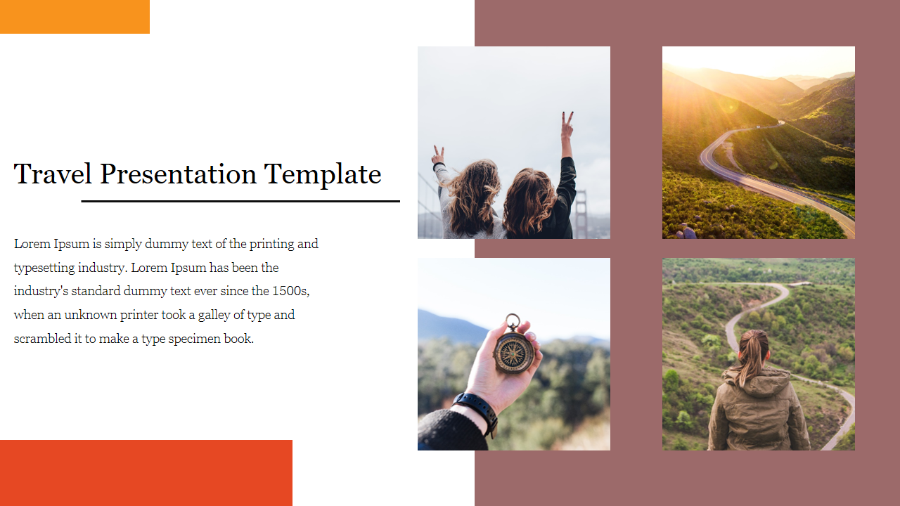 With four image holders and ample text space, presenters can highlight the beauty and excitement of various destinations clearly. Against a clean white background, the template ensures your content stands out while a brown backdrop adds warmth and depth, enhancing the overall aesthetic.