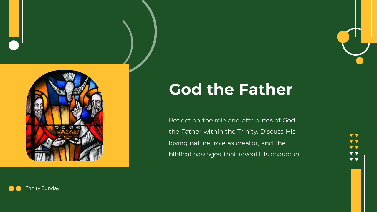 "Embrace the mystery of the Triune God." Trinity Sunday celebrates the central doctrine of Christianity the Holy Trinity, where God is understood as three persons in one divine essence. It is a day for reflection and contemplation on the nature of God, the relationship between the Father, Son, and Holy Spirit, and the profound love and unity found within the Trinity. With this template, you can effectively convey the significance of Trinity Sunday, explore theological insights, and create engaging presentations that deepen understanding and faith. Let this template be your guide to crafting impactful presentations that inspire and enlighten.