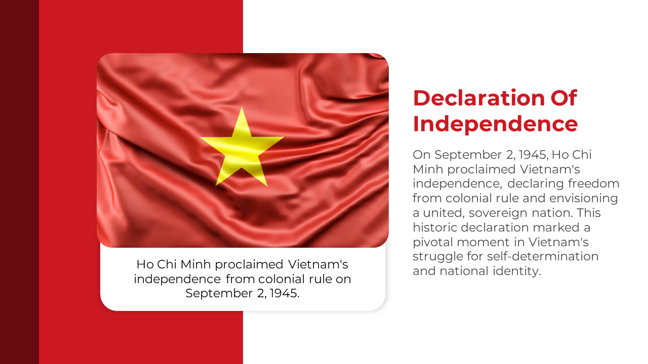 This PowerPoint template is perfect for educators, historians, event organizers, and anyone who wants to present information about Vietnam National Day effectively. The slides are designed to highlight the history, significance, and celebrations associated with this important day. Fully editable, you can customize each slide to suit your specific needs and audience. Using this template will make your presentations more engaging and informative, helping you clearly convey the importance of Vietnam National Day. With a professional layout and visually appealing design, this template ensures your message stands out. Download this template now to create compelling presentations that honor Vietnam's independence and heritage!
