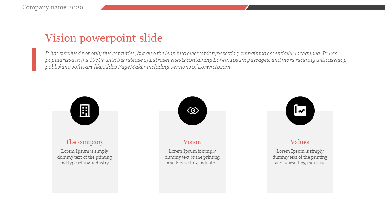 Looking to spice up your presentations with a captivating vision PowerPoint slide? Introducing our Vision PowerPoint Slide template! It features a simple yet elegant design with three rectangle textboxes for vision, values, and company details, this template is perfect for expressing your organizational vision with clarity and impact.