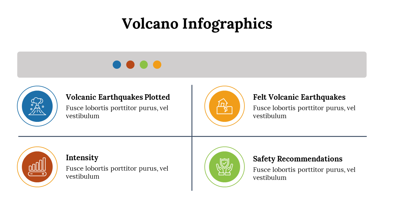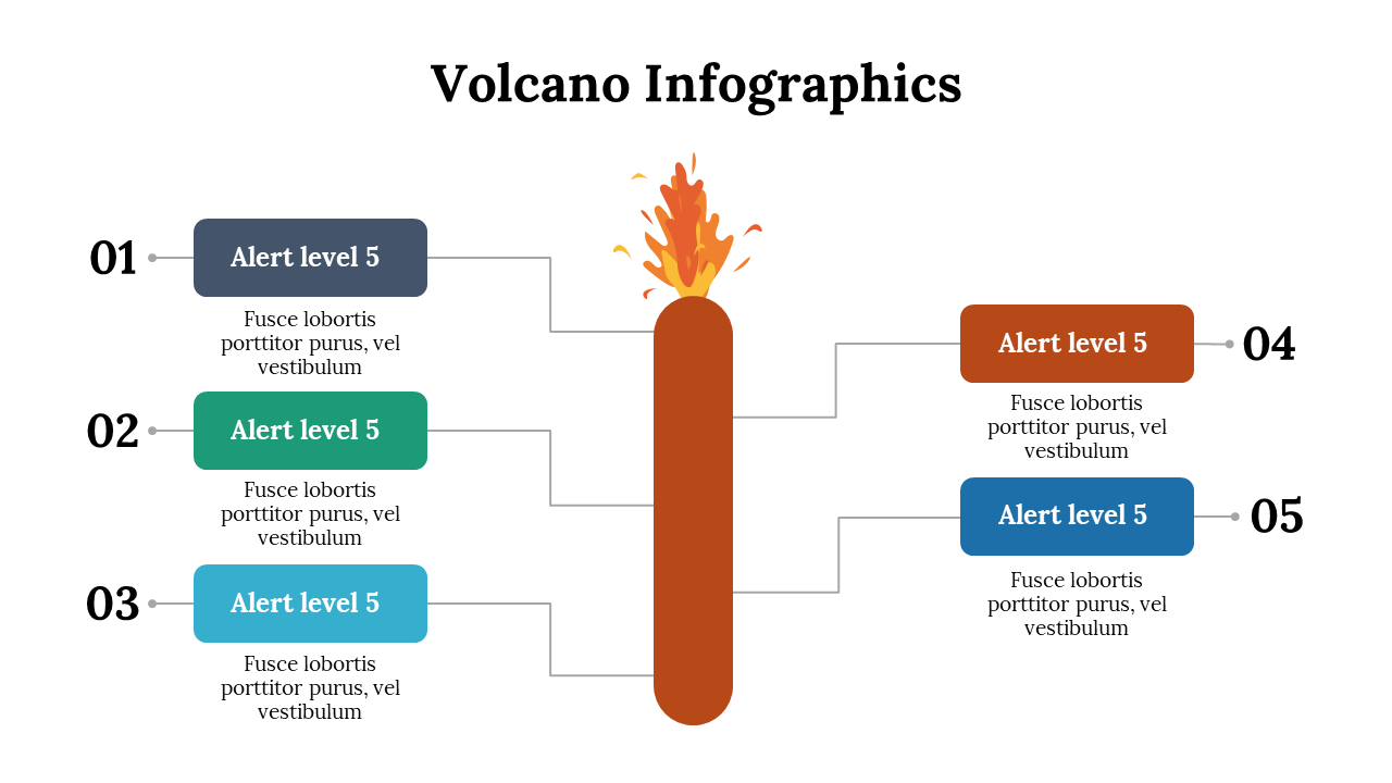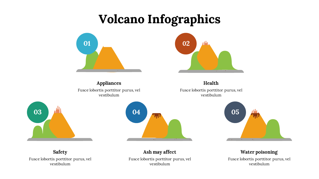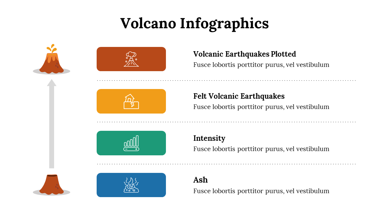 Volcanoes are geological formations that occur when magma, ash, and gas escape from beneath the Earth's surface through an opening called a vent. The study of volcanoes is an important field of research for geologists, seismologists, and other scientists who work to understand the Earth's structure and history. Our volcanic infographics slide deck is the perfect solution to make a presentation to talk about volcanoes. It's ideal for educators, scientists, and anyone looking to make an impact with presentations on these topics. Impress your audience with stunning graphics, charts, and diagram that captures the power of volcanic eruptions.