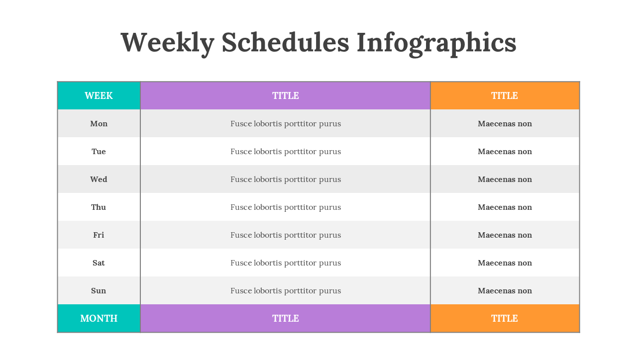 In our fast-paced era, effective time management is crucial, and "Weekly Schedules" emerge as pivotal tools in this quest. They offer a visual roadmap of tasks, appointments, and goals, allowing individuals, whether managers, students, freelancers, or homemakers, to balance work and leisure adeptly. More than just plotting time slots, these schedules amplify productivity, ensure self-care, and enable moments of spontaneity. The template, tailored to fit diverse needs, boasts fully editable slides, making it effortless to adapt to distinct tasks or commitments. It's a powerful tool for conveying plans clearly, fostering collaboration, and enhancing communication across teams or families. Its user-friendly design ensures agility in planning, streamlining the process of prioritization and delegation. We strongly advocate for this resource as a means to harness the potential of strategic scheduling, inevitably boosting productivity and holistic well-being.