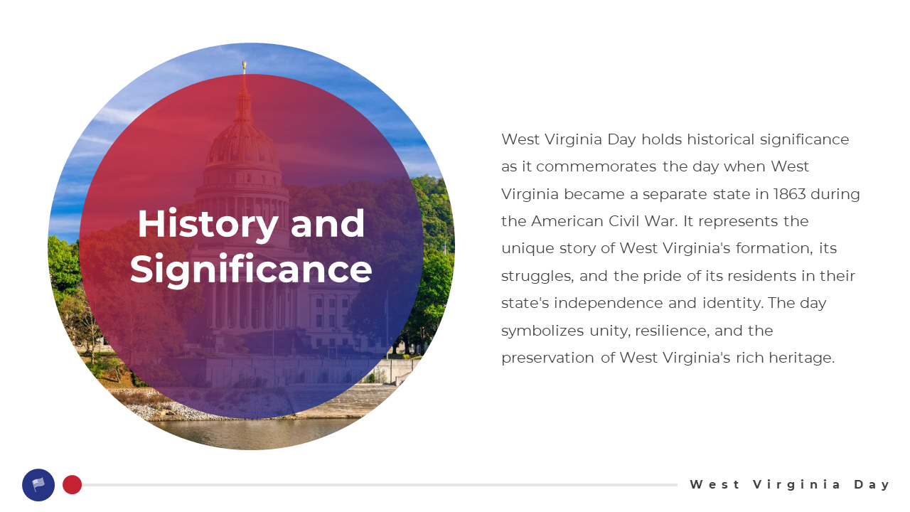 West Virginia Day is a celebration of the state's birth and rich history. On this day, West Virginians come together to commemorate their heritage and reflect on the progress made over the years. Festivities include parades, concerts, and fireworks, showcasing the state's vibrant culture and community spirit. It's a time for West Virginians to show their pride and appreciation for the beauty and uniqueness of their home. Join in the festivities and experience the warmth and hospitality that define West Virginia. You can impress your audience with this sleek template, delivering an informative presentation.