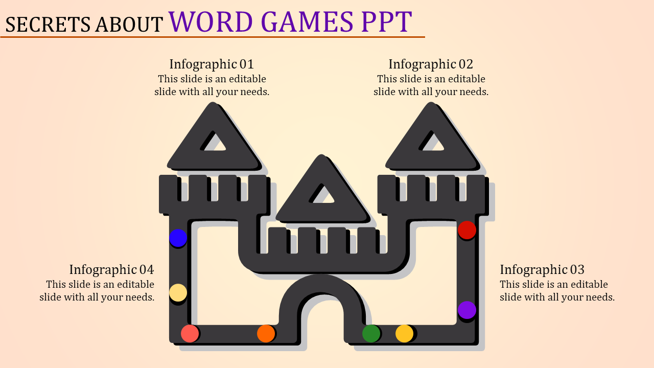 The "E-shaped Word Games PPT Template and Google Slides" presents a visually captivating design featuring a castle structure with four towers, each adorned with a differently colored circle. These circles are interconnected by lines, forming an intriguing E-shaped arrangement.