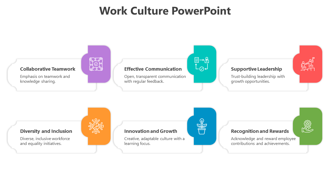 Work Culture is the essence of an organization, encompassing its values, beliefs, and behaviors that define how employees interact and work together. It's the bedrock of employee engagement, productivity, and overall business success. Our Work Culture PowerPoint serves as a comprehensive tool to delve into and enhance your company culture, workplace culture, or business culture. Designed for HR professionals, managers, and leaders, this template offers editable slides that enable you to articulate, assess, and transform your work culture. It aids in communicating core values, norms, and expectations, fostering an inclusive and positive work environment. Use this resource to shape, evaluate, and align your work culture with your organizational objectives and values. Encourage your audience to harness this template to cultivate a thriving work culture that fuels achievement and retains top talent.