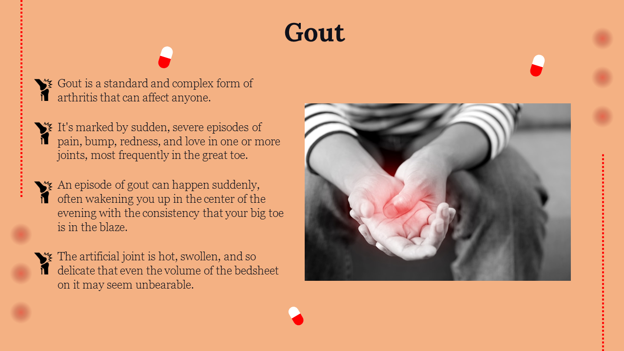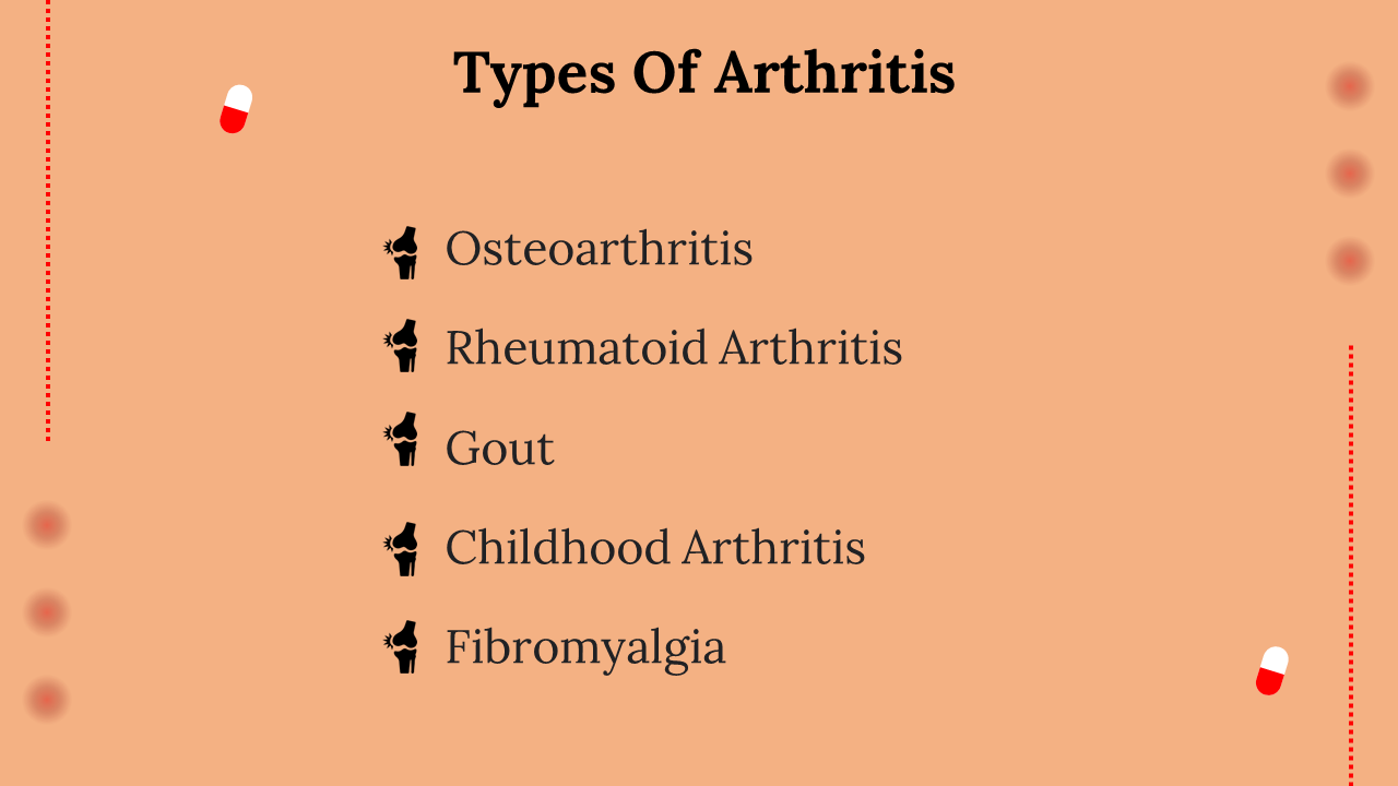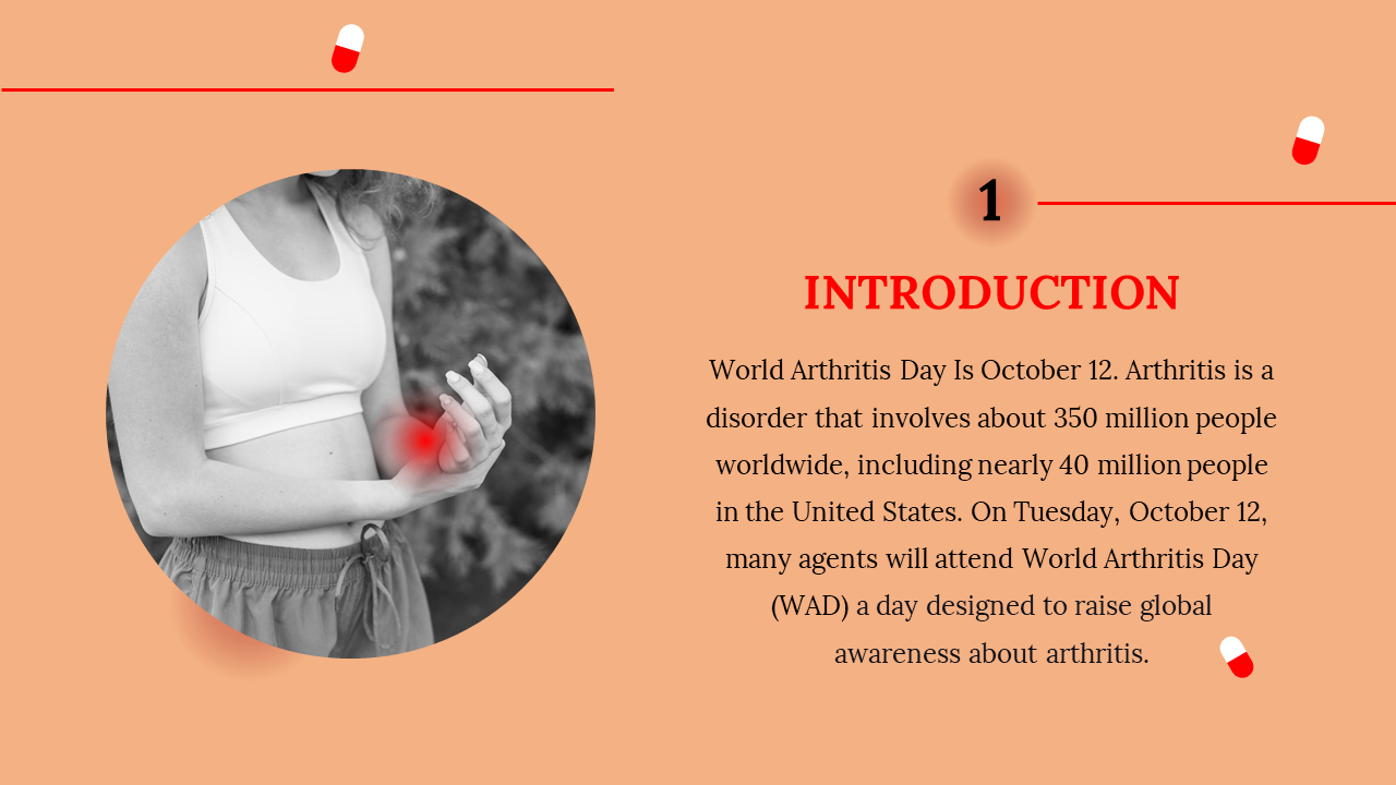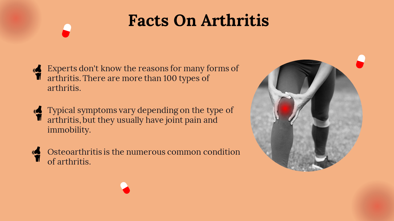 "Arthritis can make our energies slow and painful, and we cannot let that occur." Get this World Arthritis Day PowerPoint template to make a powerful awareness presentation for this special day. It is an international awareness day marked every year on October 12th to extend awareness about the impact and existence of rheumatic and musculoskeletal diseases. Arthritis is a disorder that primarily affects the knees and involves about 350 million people worldwide. Our slide deck contains 37 slides to present the introduction, facts on Arthritis, types, symptoms, causes, analysis methods, treatment, etc. The HD images, theme colors, and relevant information make this slide professional and easy to use. Also, it is entirely editable. Try it now!