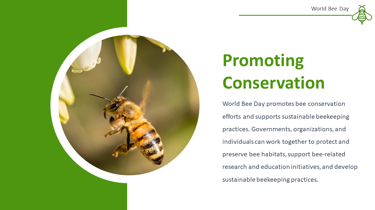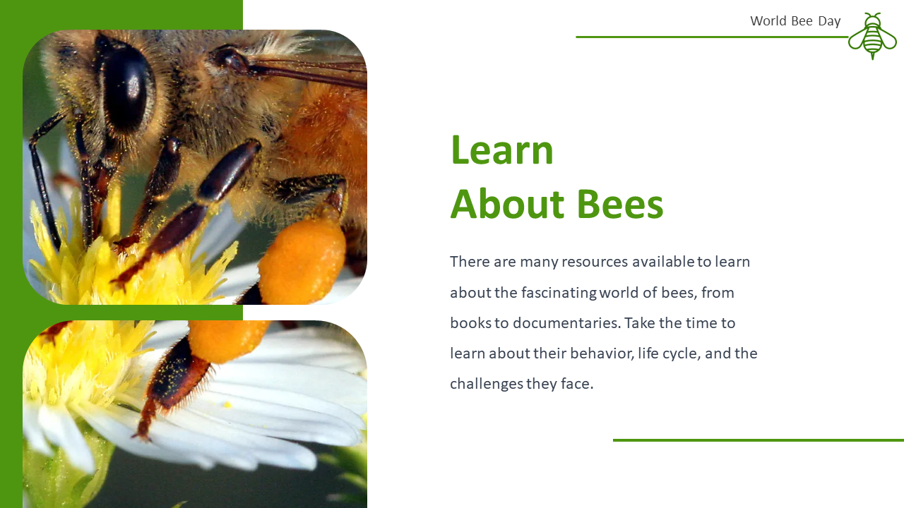 Buzzing with excitement, May 20th marks World Bee Day, a celebration of the vital role these small but mighty pollinators play in our ecosystems. From honey production to sustaining our food supply, bees are crucial to our planet's health. Let's honor and protect these amazing creatures today and every day. Celebrate Bee Day with our new deck, which features interesting content and vibrant images. The layouts are designed to help you add information perfectly, and the slides are arranged in a perfect sequence for a quick and seamless presentation.