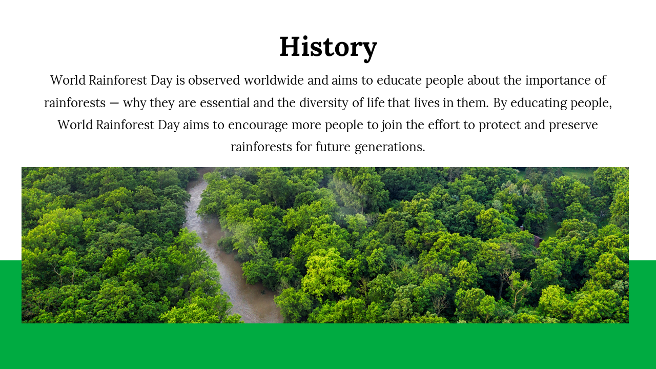 Are you ready to embark on a journey through the world's most biodiverse ecosystems? World Rainforest Day is an annual event celebrated on June 22nd to raise awareness about the vital importance of rainforests for our planet's health and wellbeing. Rainforests provide essential services such as oxygen production, climate regulation, and biodiversity conservation, yet they are facing unprecedented threats from deforestation, climate change, and illegal wildlife trade. Use our template to educate and inspire your audience to conserve rainforests and the invaluable services they provide.