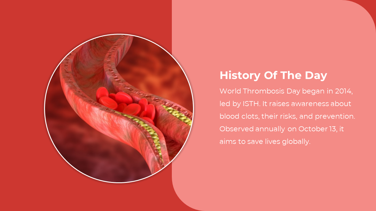 World Thrombosis Day raises awareness about blood clots, their risks, prevention, and treatment, promoting global thrombosis education and advocacy. Elevate your World Thrombosis Day presentations with our meticulously crafted PowerPoint template. This SEO-optimized, USA-based English content offers a unique narrative style, blending second and third-person perspectives. It engages your audience in an informative, positive, and professional manner. This template encapsulates the essence of World Thrombosis Day, empowering you to convey crucial information effectively. From risk factors to preventative measures, it covers it all. Healthcare professionals, educators, and advocates dedicated to raising awareness about thrombosis will find immense value in this resource. Tailored for maximum usability, every slide is fully editable, allowing customization to suit your specific message. This template simplifies your presentation process while enhancing your ability to connect with your audience. Encourage your audience to use this template, and together, let's make a significant impact on World Thrombosis Day.