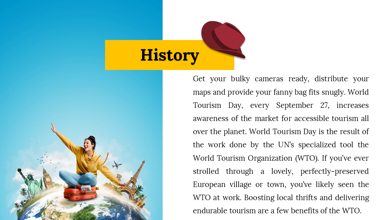 World Tourism Day is an annual event that raises awareness about the social, cultural, and economic impact of tourism worldwide. With our customizable and editable presentation template, you can showcase the importance of sustainable tourism, cultural exchange, and the hospitality industry. You can inspire your audience to travel responsibly, appreciate diverse cultures, and support local economies. Our World Tourism Day PowerPoint template can help you create an engaging and informative presentation that promotes the benefits of global tourism.
